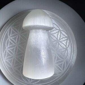 A selenite crystal mushroom carving showcases the ethereal beauty of selenite, resembling a delicate mushroom. Selenite promotes mental clarity, purification, and spiritual growth, making it a potent tool for meditation and energy cleansing. Its soothing energy can bring serenity and balance to any space, fostering a sense of peace and clarity within. Pair with any crystal to potentiate its intentional power. Great addition to decor / crystal display.