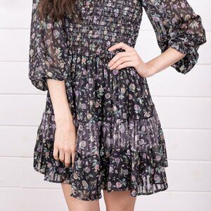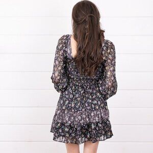 The Allison Smocked Mini features long sheer sleeves, a unique dark floral print, a square neckline and smocking detail.