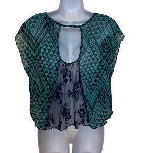 Self Esteem EUC Green Blue Abstract Print Lace Inset Sheer Blouse Sz M