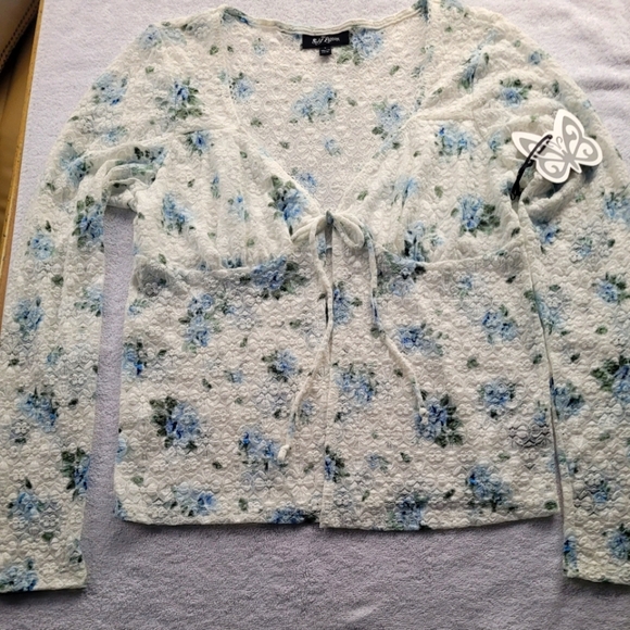Brand new with tags. Embrace elegance with this floral lace tie-front top. Featuring a delicate blue floral pattern, this top is perfect for any occasion. The intricate lace design adds a touch of sophistication to your wardrobe. It's soft and stretchy. 90% nylon and 10% spandex. approx measurements are shoulder to shoulder 15" x 22 L x 17W x 24" sleeves. A little spaghetti tee needs to be worn under it because it is see through.very cute! It can be worn as a petite adult. please measure