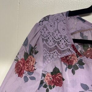 Charming lavender blouse with red floral pattern. Features lace accents and tie front. Bell Sleeves. See all photos as they are part of description