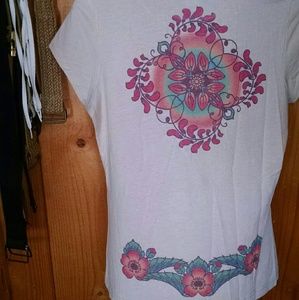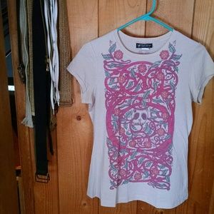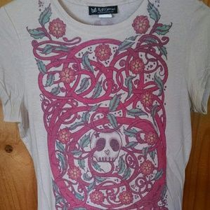 A well-loved, super soft cream shirt from the mid-2000s, printed front and back with a super cool skull, vines, and flowers design. Slight pilling under the arms, sublimated print has a few imperfections near a the collar. Size is a Juniors' XL, feel free to ask for specifics!