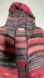Striped knit sweater with pink, red, and gray hues. Stylish and cozy for any occasion.