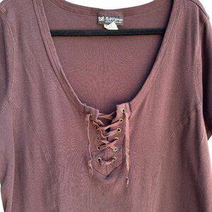 This women's lace-up top by Self Esteem offers a stylish blend of comfort and chic design. Crafted from 100% cotton, it provides a soft and breathable fit. With its deep brown hue and lace-up neckline, it's an elegant addition to any wardrobe.