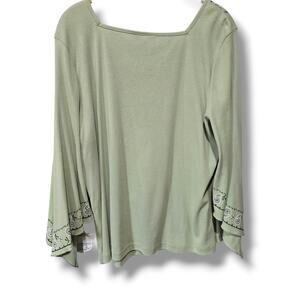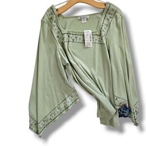 Beautiful Self Esteem sage green top featuring embroidered paisley trim and flowy bell sleeves. Soft cotton-polyester blend for comfort and style. Plus size 18/20, brand new with tags.