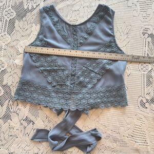 Stylish sage green sleeveless top with delicate crochet trim and a back tie detail. Women's XL.