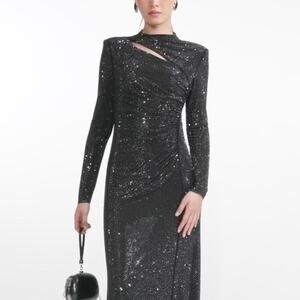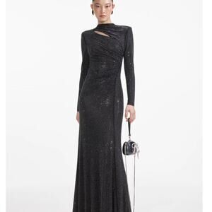 Self Portrait Black Rhinstone Mesh Cut Out Longsleeve Maxi Dress