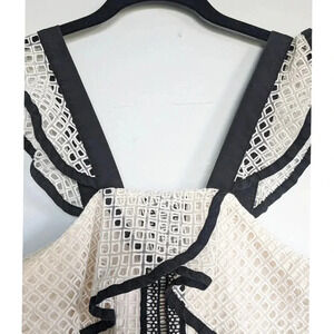 Contrast ruffle trim at the shoulder straps and peplum flare waistline.