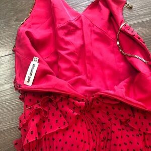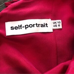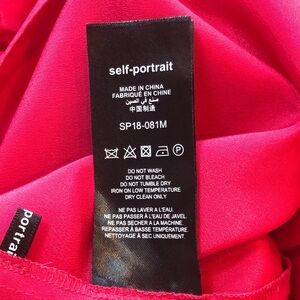 This stunning Self Portrait maxi dress features beautiful polka dot plumetis fabric with crochet trim and ruffle accents. The V-neckline and sleeveless design are perfect for any occasion, from formal events to parties and weddings. The dress has a flattering long length and a zip closure.