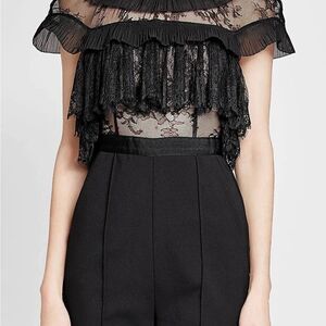 Self Portrait fine lace black cropped wide leg jumpsuit. Features a fitted lace bodice framed with pleated lace, organza trim and off the shoulder lace detail. Cropped wide leg cut, center back zipper, high neck, open shoulder, slanted slip pockets and back welt pocket with button fastening.