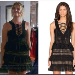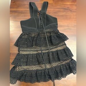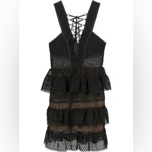 Self-Portrait Lace-up Tiered Dress in black is designed with a plunging V-neck that laces up on the front . It features cut-away shoulder straps and a ruffled three-tiered guipure lace that flows down. concealed back zippered closure. Lined.