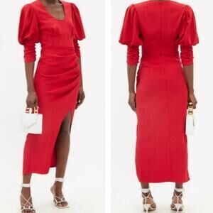 Self Portrait red puff sleeve stretch crepe midi dress bodice slit
