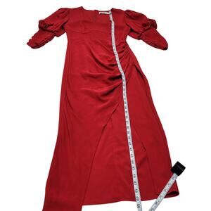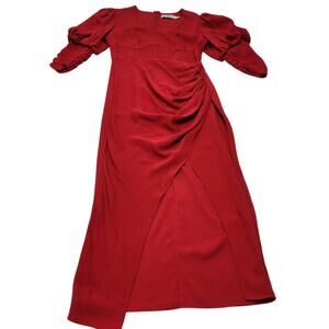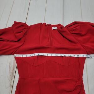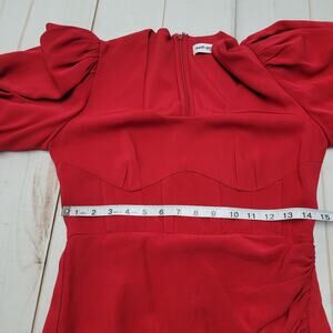 Stunning Self Portrait stretch crepe dress! Red with a detailed, pieced bodice and eye-catching puff sleeves. The front leg slits up and the middle is shirred for a really flattering fit. Dress is gently worn but it does have a small mark on the back of one shoulder and a few tiny pin holes on the leg slit from a pin being used. Size US 6