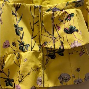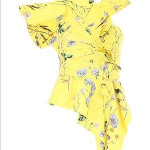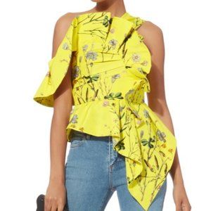 Yellow floral printed taffeta, this top is designed with a flattering asymmetric ruffle detail and continues into a peplum hem.