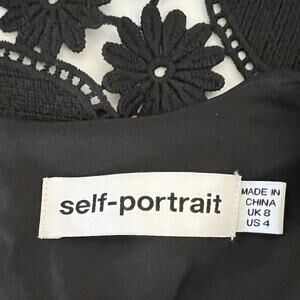 Keywords: self-portrait mini dress, black guipure lace dress, twist front dress, lace hem party dress, V-neck cocktail dress, size 4 black dress, date night mini, Self-Portrait UK 8, lbd, little black dress, night out.