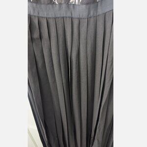 Elegant maxi dress with floral lace bodice. Sheer long sleeves. Pleated black skirt with side slit. Perfect for evening wear.