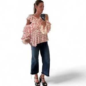 Floral Print Ruffle Pleat Top Blouse. Pleated Top/Blouse in Cream