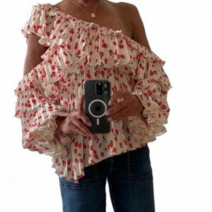 ditsy floral, one shoulder, jacquard fabric, ruffle details, pleated blouse, embroidered trim, cream color, feminine style, delicate embroidery, elegant top