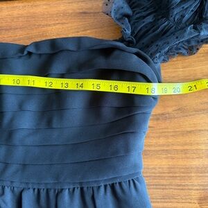 This midi dress is cut from crepe. It features a flattering square neck, shirred contrast dot mesh sleeves with a shoulder frill detail. The fitted bodice is pleated and the skirt falls to a flared silhouette. This style is lined.