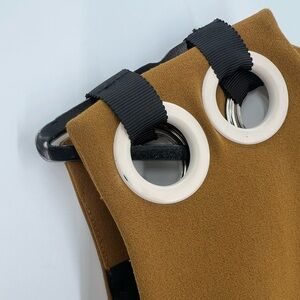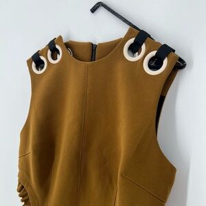 Sleeveless mini dress with ruffled adjustable side cut out tie detail. Eyelet top details. Black felt hem bottom trim. Last photo is the dress but mine has a felt trim. Not sure if this dress came in a midi version or it has been professionally altered with the additional wool felt. It looks like it’s part of the dress but cannot find the exact dress online.