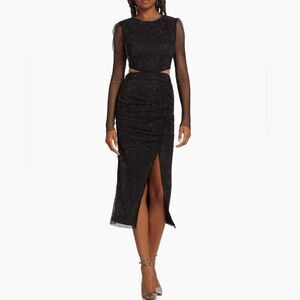 This shimmering fishnet Diamante midi-dress gathers at the hip in a ruched design. Cut with a side slit, this style features sheer long sleeves and mesh cut-outs at the waist.
