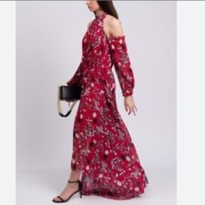 Self-Portrait Floral Chiffon Maxi Dress Red Cold Shoulder Pleated Hi-Low Size SM
