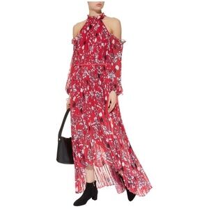 Self-Portrait Red Floral Pleated Chiffon High Neck High-Low Cold-Shoulder Maxi Dress. Size SM MSRP $784.00