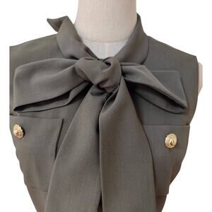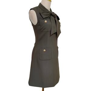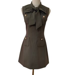 Uniform chic comes with feminine flair in this khaki twill mini dress. With an elegant high neck, a bow neck tie and gold buttons add chic detail – pair with glossy boots and heels alike.