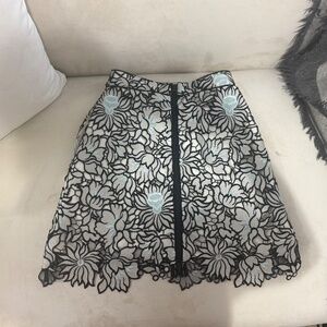 Lightly worn Self-Portrait lace guipure mini skirt size UK 4/US 0 with black contrasting exposed zipper in the back. Beautiful white lace with subtle pops of blue scattered throughout this high quality lace guipure.