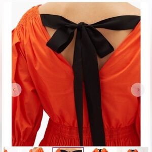 This stunning orange midi dress by Self-Portrait is perfect for wedding guests and cocktail events. It features a pleated design with a flattering V-neckline and charming puff sleeves, creating a romantic and modern silhouette. Great condition