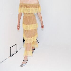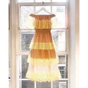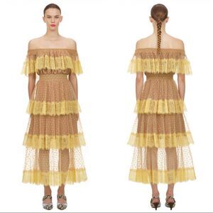 This flattering off shoulder dress is cut from polka dot mesh and finished with delicate fine lace trims. Fitted and shirred at the waist it falls to a tiered midi skirt. This style is lined.