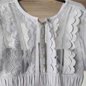Color: I would say it has more of a soft laveder/gray tone to it or light gray with white front pearl buttons