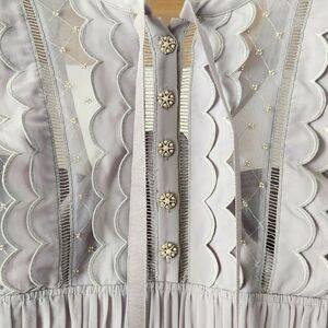 This floaty midi dress is cut from beaded mesh and chiffon, the bodice is detailed with scalloped trim and finished with a diamante button placket, while beaded mesh sleeves frame the figure and lend a romantic air. Showcase a strappy heel below the pleated