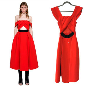 Self-Portrait US2 UK6 Ayelette Cutout Double-Crepe Dress $640 Off Shoulder Red