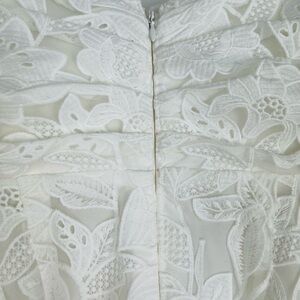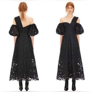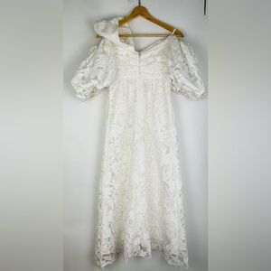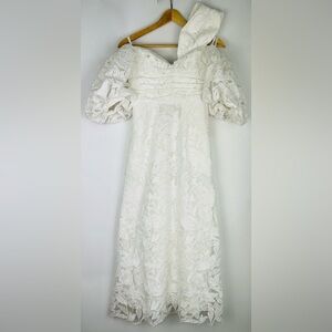 Elegant white lace midi dress. Features one-shoulder design. Puffy sleeves add volume.