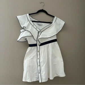 Elegant white dress with ruffle details. Asymmetrical design. Perfect for special occasions.
