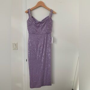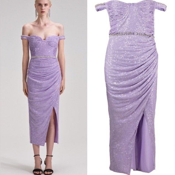 Dazzle in this lilac sequin dress, with a diamante-encircled waist and sparkling off-the-shoulder neckline. Designed to show off the form, an ultra-feminine bustier nips in the waist before falling to a gathered side-split skirt. Pair with high heels and old Hollywood waves for timeless glamour. Check the Size Guide for your perfect fit.