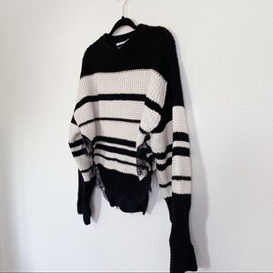 This heavy gauge striped monochrome knit is designed with a black lace trim detail at the hem. This style is unlined.
