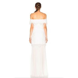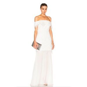 Self-Portrait's off-the-shoulder bridal gown encapsulates timeless romance. Ornate guipure lace floats throughout a strapless neckline to unveil a delicately pleated semi-sheer skirt. Captivate your guests as a vision in white with minimalist accessories.