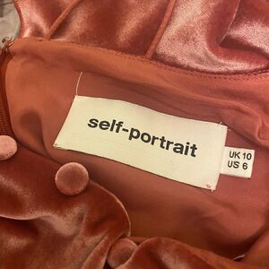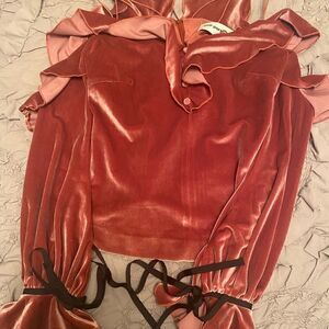 Circa 2015. Self Portrait velvet top features an off shoulder neckline with ruffle detailing, spaghetti straps, long ruffled sleeves with grosgrain tied ribbons and peek through lace, and a back zip closure. Lined.