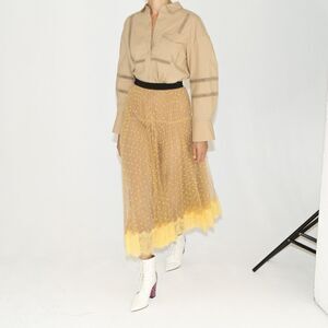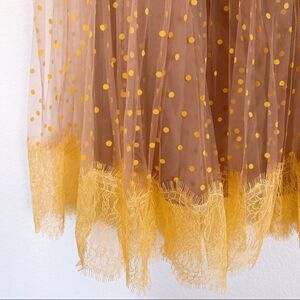 This skirt is cut from polka dot mesh and finished with a contrast lace hem and solid grosgrain waistband. This style is lined.
