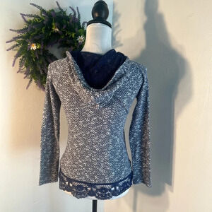 Self-esteem, L hooded shirt/sweater. Knitted lace detail on drop hem, hood,pocket, L= 23” 55% cotton 45% polyester