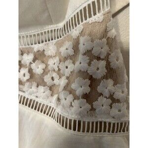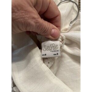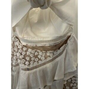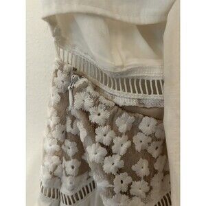 The Selfie Leslie Aramis Strapless Lace and Ruffle Mini Dress in white, size small, is perfect for various occasions such as travel, weddings, parties, and casual outings. The sleeveless dress features a floral lace mesh over a nude skirt lining. The dress length is short, making it a stylish choice for those looking for a mini dress with a touch of ruffle accents. The tie back side zip and hook and eye closure adds a unique touch to this flattering and chic dress from the brand Selfie Leslie.