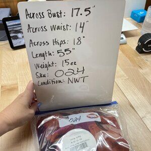 Across bust = 17.5 inches, across waist = 14 inches, across hips = 18 inches, length = 55 inches.