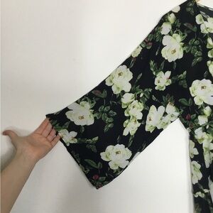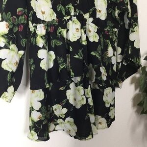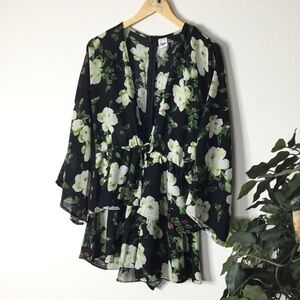 A gorgeous floral romper with wide sleeves, a low vcut, and ruffle bottom. It’s a romper, but looks like a dress when standing. A drawstring around the waist to make it a more flattering fit. Slightly sheer and the layers keep the bottom modest. Long zipper down the back