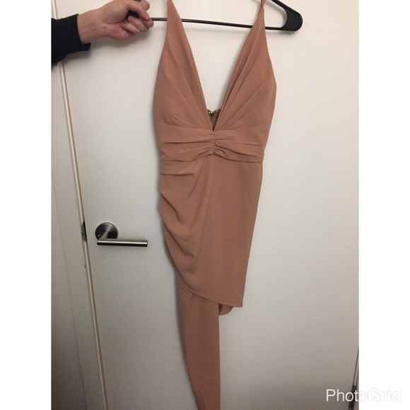 This nude dress is a charming piece. It's form fitting and accentuates your curves. The deep V cut in the front and the high-low end of the dress reveals your feminine and sexy side without compromising grace and class. It's perfect for a spring or summer wedding or a romantic date :) in almost perfect condition! I wore it only once!