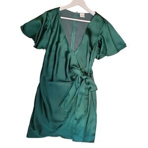 Selfie Leslie IRELAND SILKY ANGEL SLEEVE FAUX WRAP DRESS JADE M