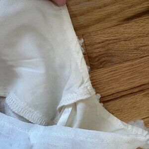 I wore this dress 3x times. There are some small makeup stains on the inside of the dress on the neckline. These are not visible when the dress is being worn and likely will come off with stain removed.