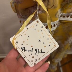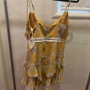 Yellow floral sundress that hits me a couple inches above the knee (I’m 5’ 5”). Has adjustable straps, zipper on back, adjustable peek-a-boo bow at front. New with tags, never worn.