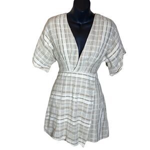 Selfie Leslie small brown and white textured knit mini dress. Asymmetrical look to skirt hem, hidden back zipper, lined bottom, semi sheer, back tie